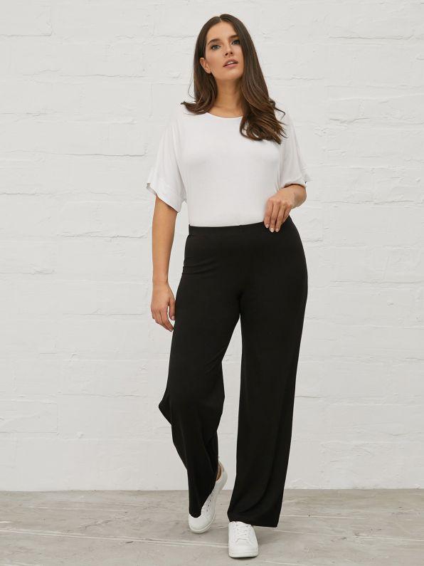 S- 42/44, M 46/48, L 50/52 Fijne broek in jersey. 97% viscose, 3% elastan
